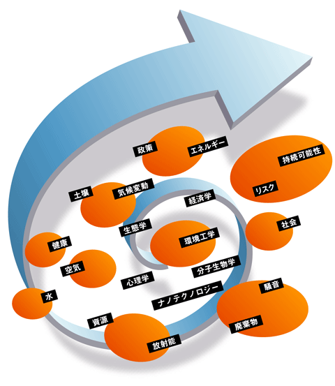 研究対象は、水・大気・気候変動・土壌・放射線・廃棄物・騒音・生態系・環境リスク・エネルギーなどきわめて多岐にわたります。ターゲットにしているサイズも分子レベルから地球規模にまで及び、研究方法はフィールド調査から研究室実験、計算機シミュレーションに基づくものまで多様です。環境問題を解決するためのテクノロジーの開発やその本質に横たわるサイエンスの追及を通して他分野の科学者や国家、企業そして我々の社会全体に示唆を与え続けています。