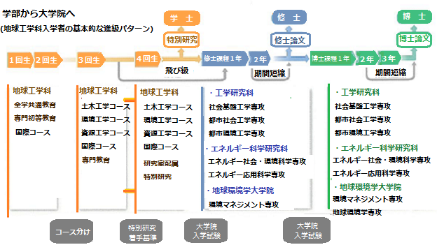 3年次への進学にあたっては、土木工学コース、環境工学コース、資源工学コースのいずれかにコース分けがなされます。その後は卒業まで、所属したそれぞれのコースの専門科目を履修します。4年次からは、地球工学に関係する大学院各専攻の研究室に配属されて、特別研究(卒業論文の作成)を実施し、そのことを通じて各分野の最新の研究に触れることになります。ただし、国際コースについては入学時にコース分けがなされており、入学後、他コースへの変更はできません。